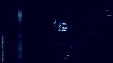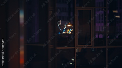 Night window view executive communicating cellphone in office. Manager messaging