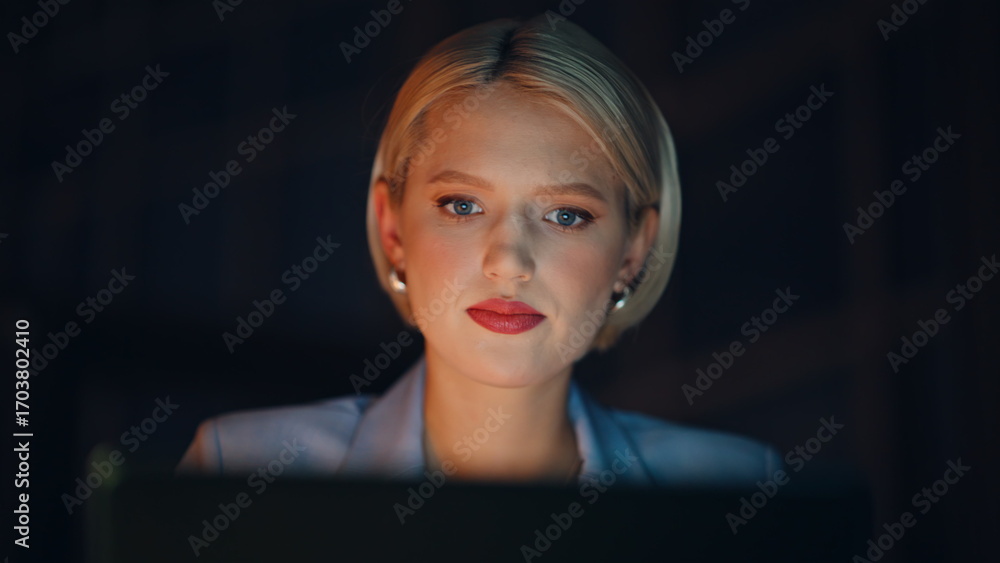 Portrait manager working late evening at dark apartment. Blonde sipping coffee