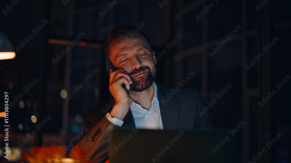 Late manager talking smartphone at computer table closeup. Smiling man calling