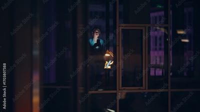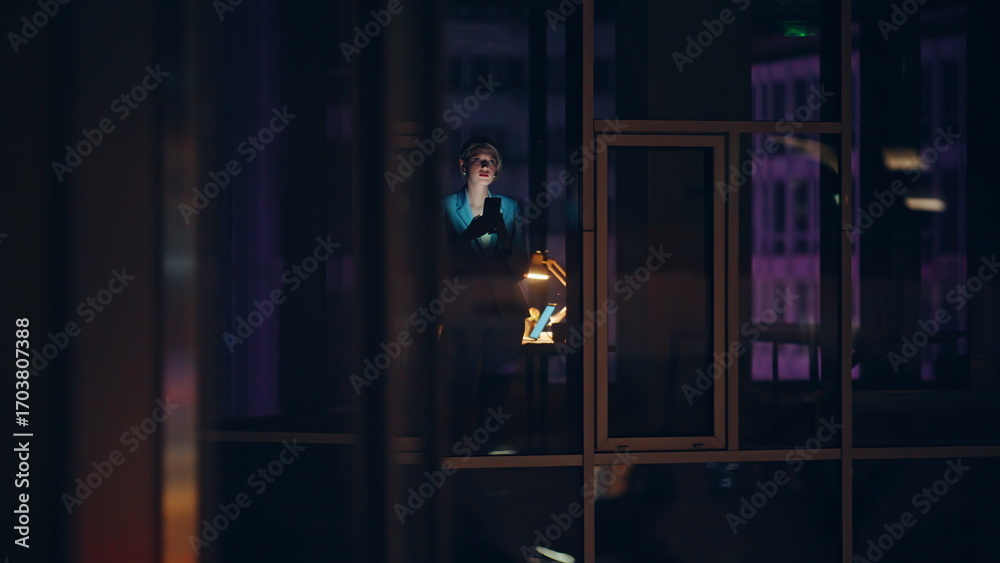 Night window businesswoman messaging smartphone in dim light. Late executive