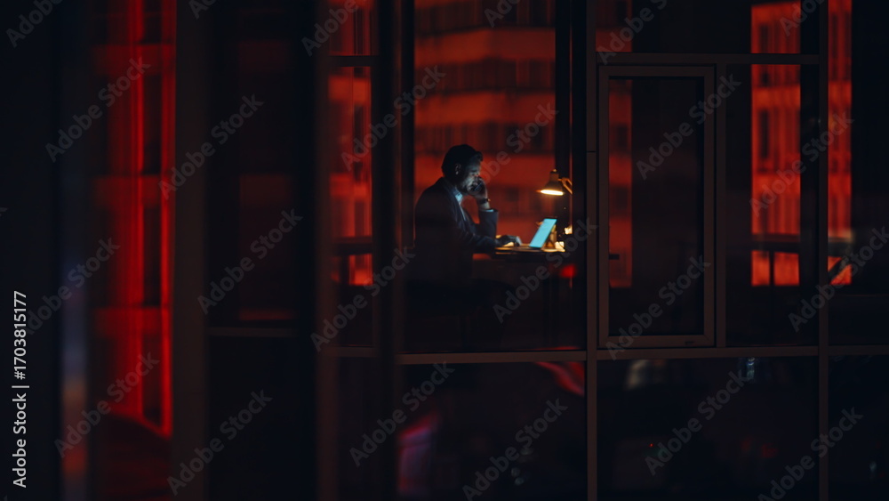 Night businessman silhouette window working alone at night talking smartphone