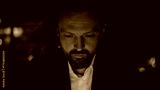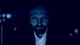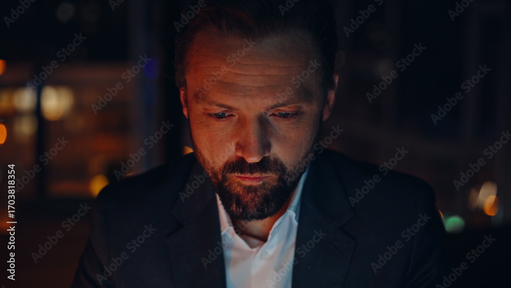 Closeup man working overtime sitting dark workspace. Tired businessman yawning