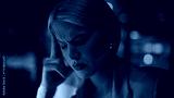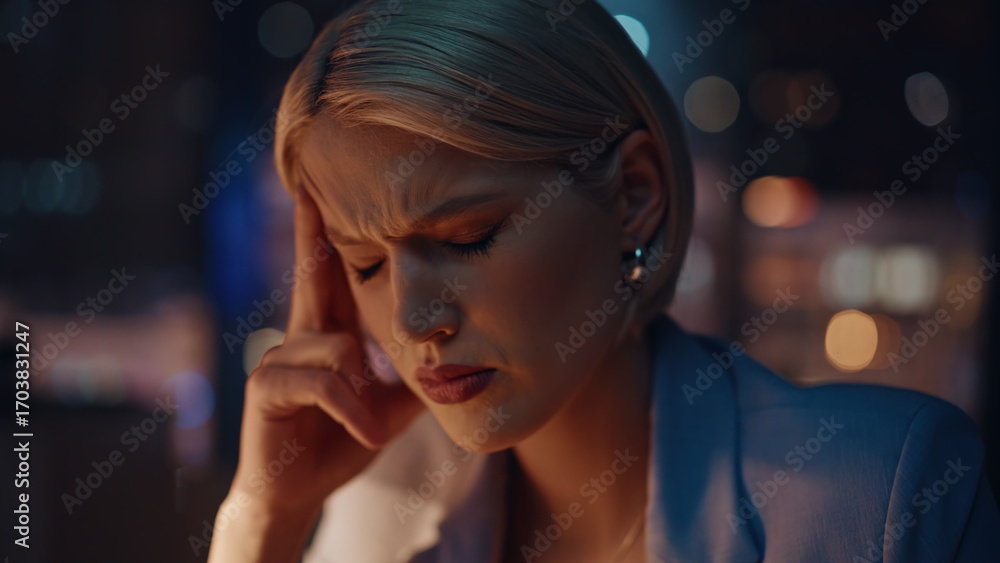 Fatigued office worker eyestrain at dark apartment portrait. Tired businesswoman