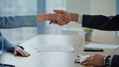 Closeup businesspeople handshake office building. Business partners agreement