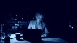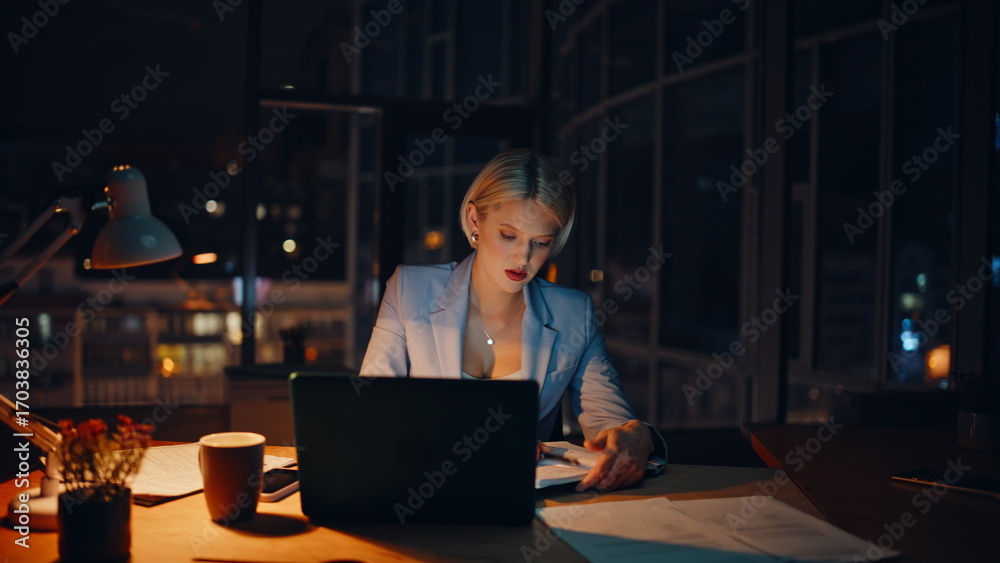 Busy employee writing copybook working laptop late evening at workplace closeup