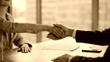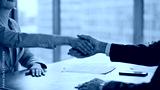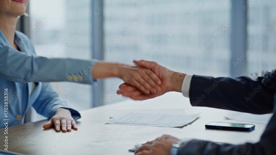 Closeup businesspeople shaking hands making negotiations modern office closeup