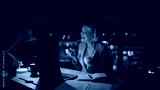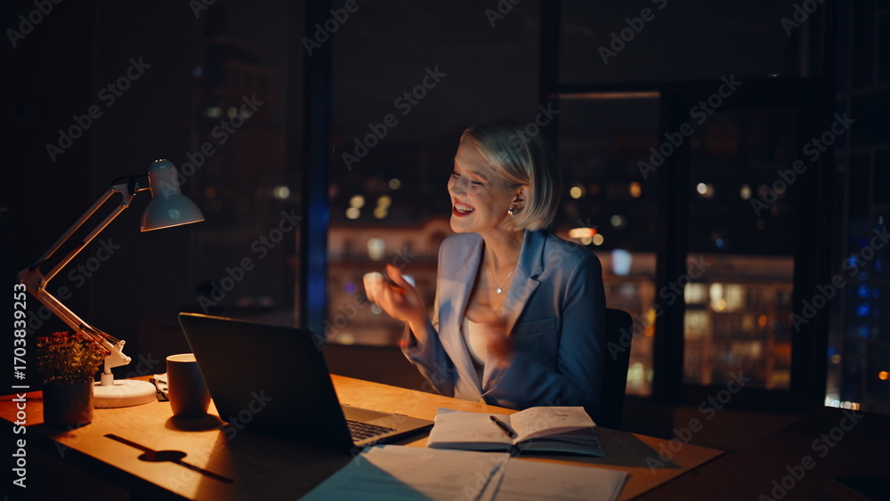 Excited businesswoman rejoicing online win sitting night office center closeup