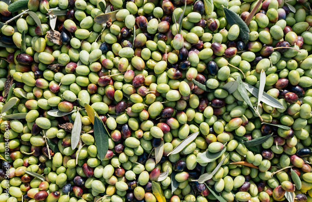Multi-colored olives background transported on conveyor belt at olive oil factory, close-up of fresh green and black olives, industrial food production, machinery processing and culinary ingredients