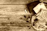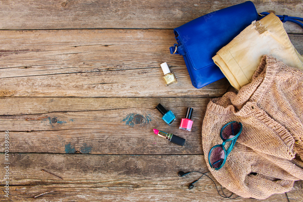 Clothing, women's accessories and cosmetics on old wooden background. Top view.