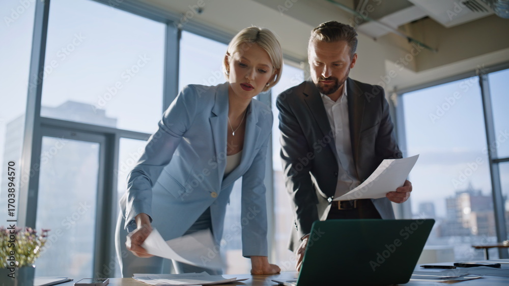 Legal professionals examining papers sunny office. Partners reviewing contract