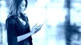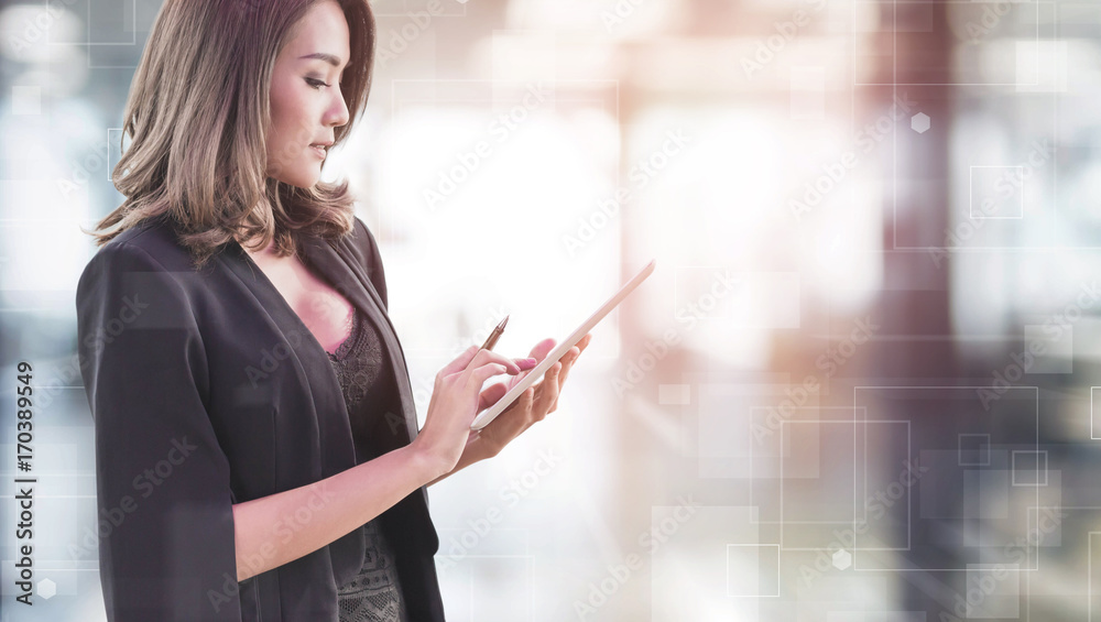 Beautiful sexy Asian businesswoman using tablet in office space with futuristic technology connection shape background and copy space.Concept of business technology connection.Vintage tone