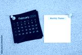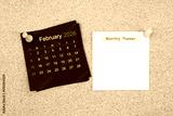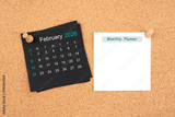 February 2026 Black calendar and blank adhesive notes for monthly planner with thumbtack on board.