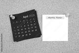 April 2026 Black calendar and blank adhesive notes for monthly planner with thumbtack on board.