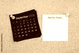 September 2026 Black calendar and blank adhesive notes for monthly planner with thumbtack on board.