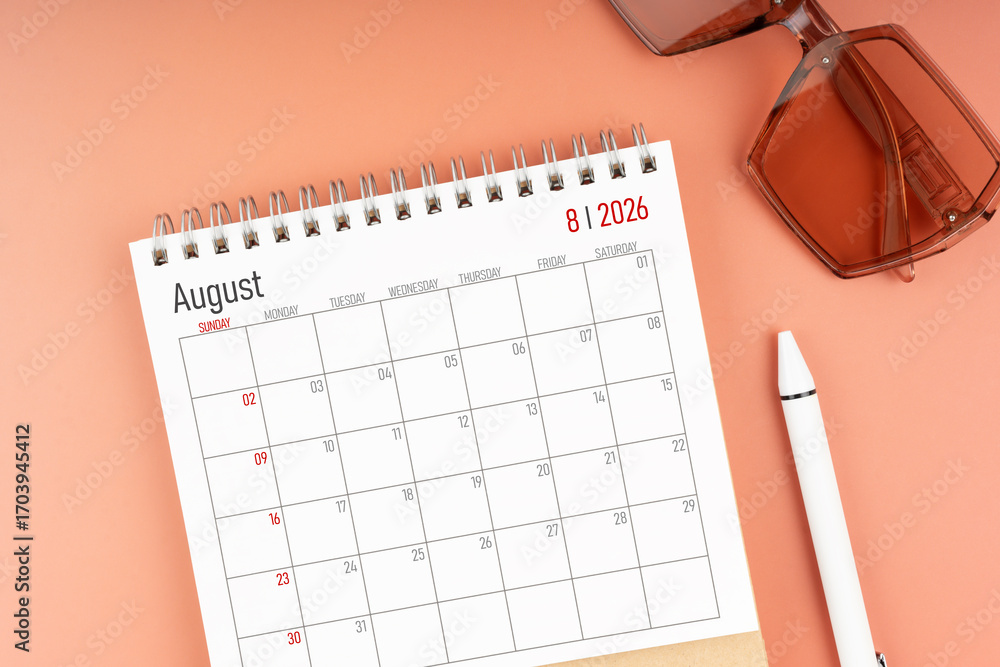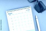 2026 August desk calendar with brown sunglasses. Directly above. Calendar and reminder concept.