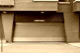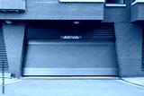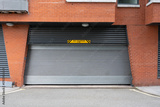 Modern building vehicle entrance with a closed metal shutter garage door and height warning sign.