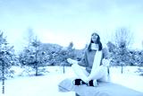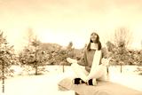 A woman in a white cap and scarf meditates peacefully in winter in nature against the background of trees on a winter Christmas morning.