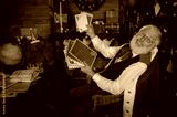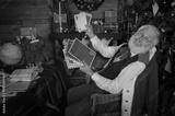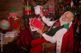 Santa Claus rejoicing with letters and mail in his post office indoors Log Cabin at the North Pole