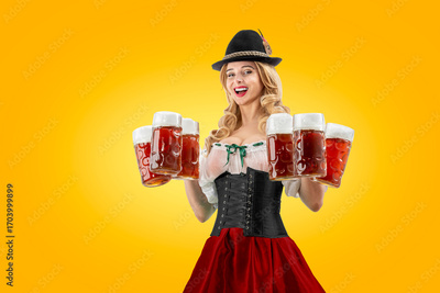 Oktoberfest girl waitress serving a mug of beer. Woman in dirndl, tyrolean hat for Bavarian German or Austrian beer party, autumn festival