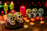 Skulls with decor for the holiday Day of the Dead. Dia de los Muertos altar surrounded by ornamented calavera, candles, flowers in the darkness. All Saints' Day evening