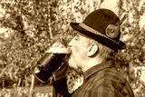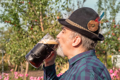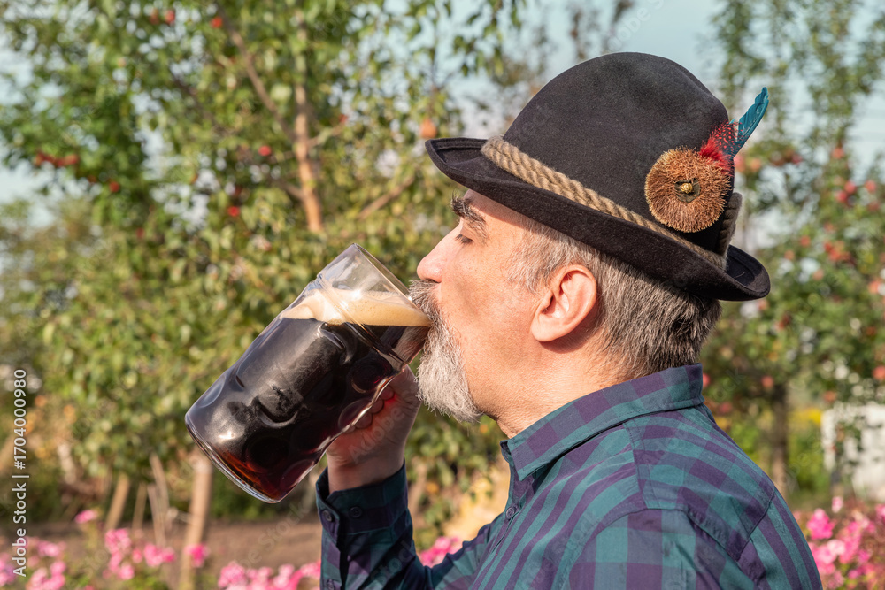 Senior men with beer mugs with Bavarian beer in Tyrolean hats celebrating a beer festival in Germany. Happy old people during the October holiday in Munich