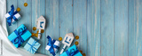 Hanukkah background. Dreidel, with blue lettering נ nun, ג gimel, ה hei, ש shin, gift boxs, gold coins on wooden background. Jewish holiday of Hanukkah.