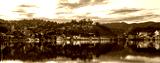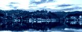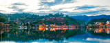 landscape of "Ban Rak Thai Village in Mae Hong Son province at dusk, showcasing a serene lakeside scene with floating lanterns and glowing reflections, surrounded by traditional buildings
