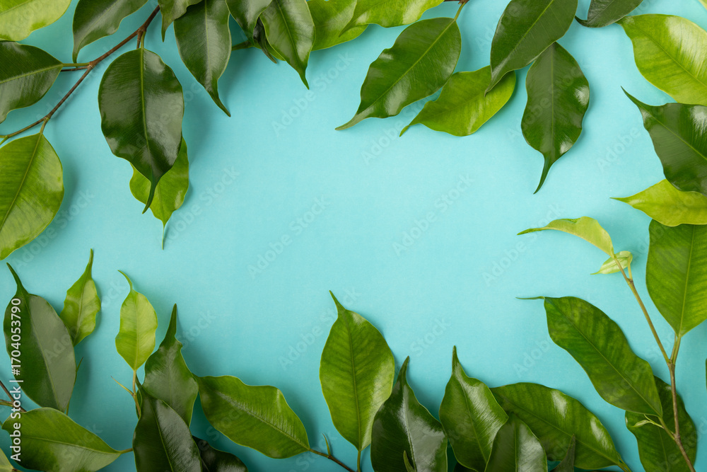 Tropical flat lay ficus benjamina leaves branch on vibrant blue surface background