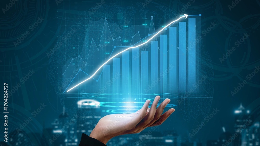 A hand presents a digital bar graph illustrating growth within an abstract data visualization context, representing success and advancement in business performance. Copula