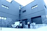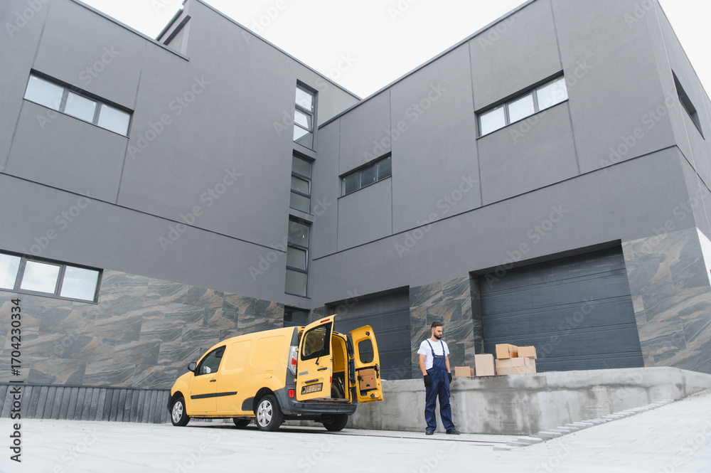 Delivery driver waiting with cardboard boxes by his van outside warehouse