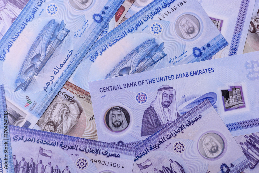 UAE money, dirhams, cash arabic banknotes for financial and business processes. Emirates cash