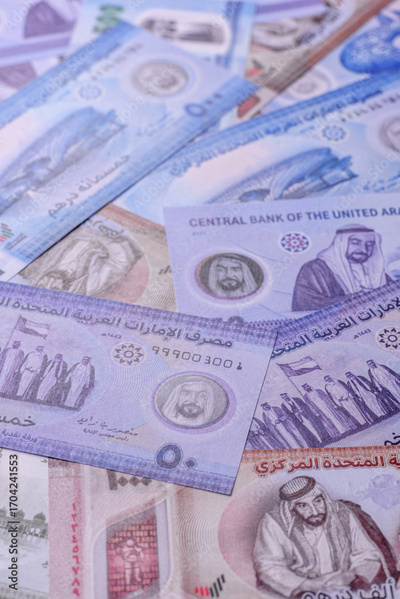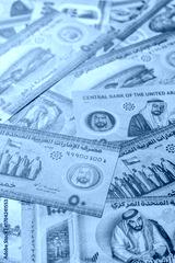 UAE money, dirhams, cash arabic banknotes for financial and business processes. Emirates cash