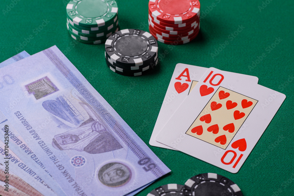 Casino game in the United Arab Emirates, dirham, chips, cards. Gambling in casinos in the Emirates