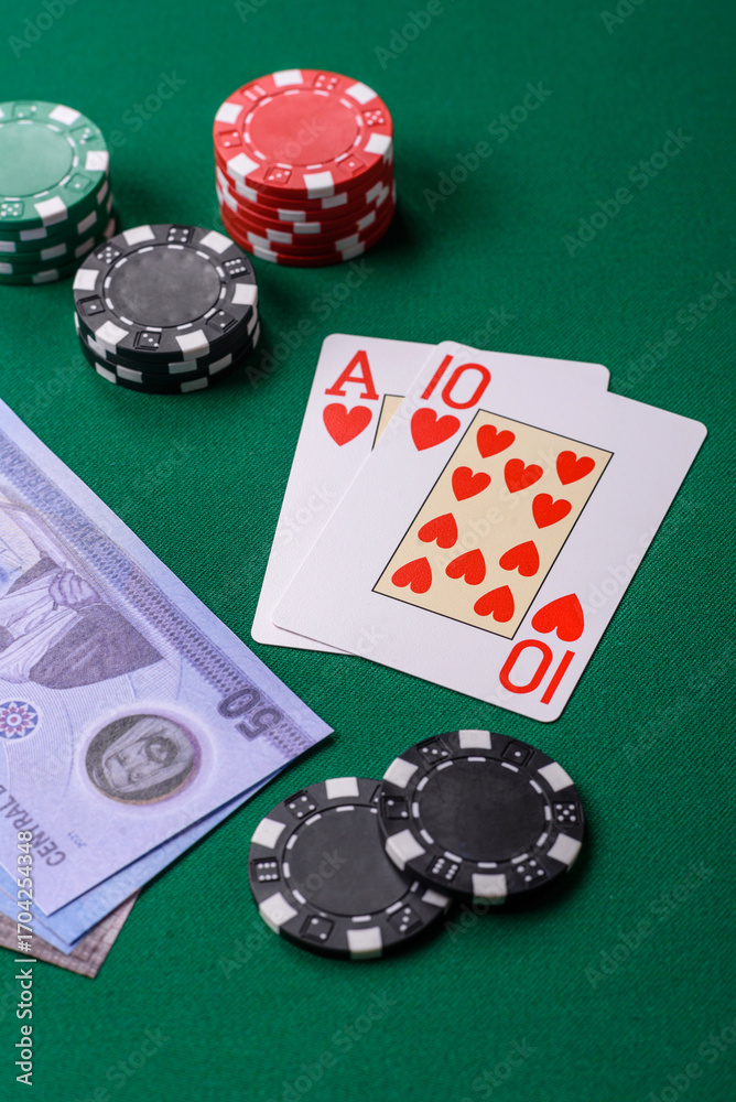 Casino game in the United Arab Emirates, dirham, chips, cards. Gambling in casinos in the Emirates