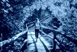 Young woman with backpack walking along a wooden path near stunning waterfalls, orange trees in Plitvice Lakes national park, Croatia at sunset in autumn. Sporty girl in forest in fall. Hiking, travel