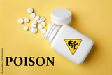 Bottle with Poison warning symbol and pills on orange background, top view