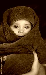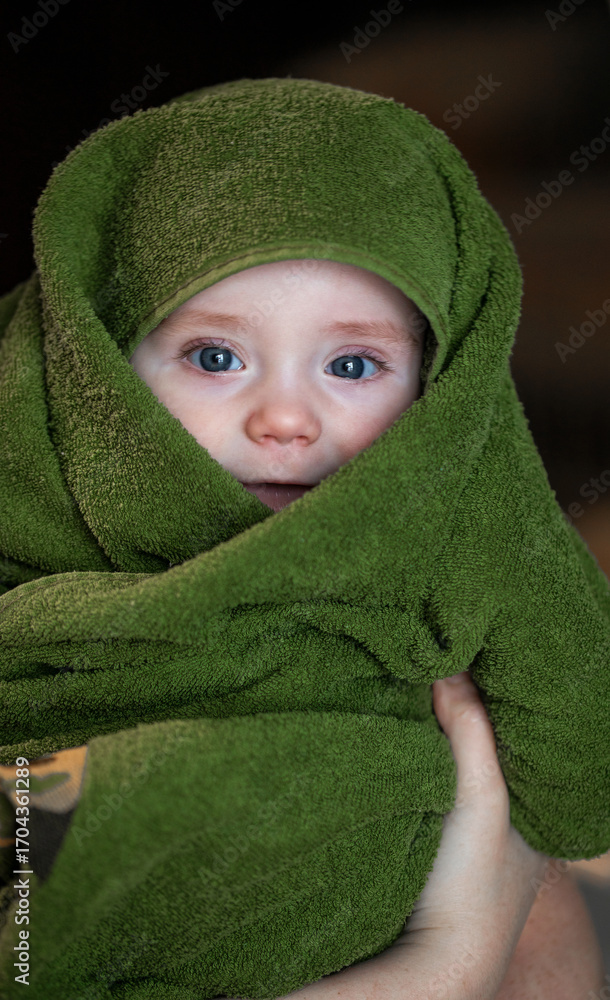 Baby wrapped in a green bath towel