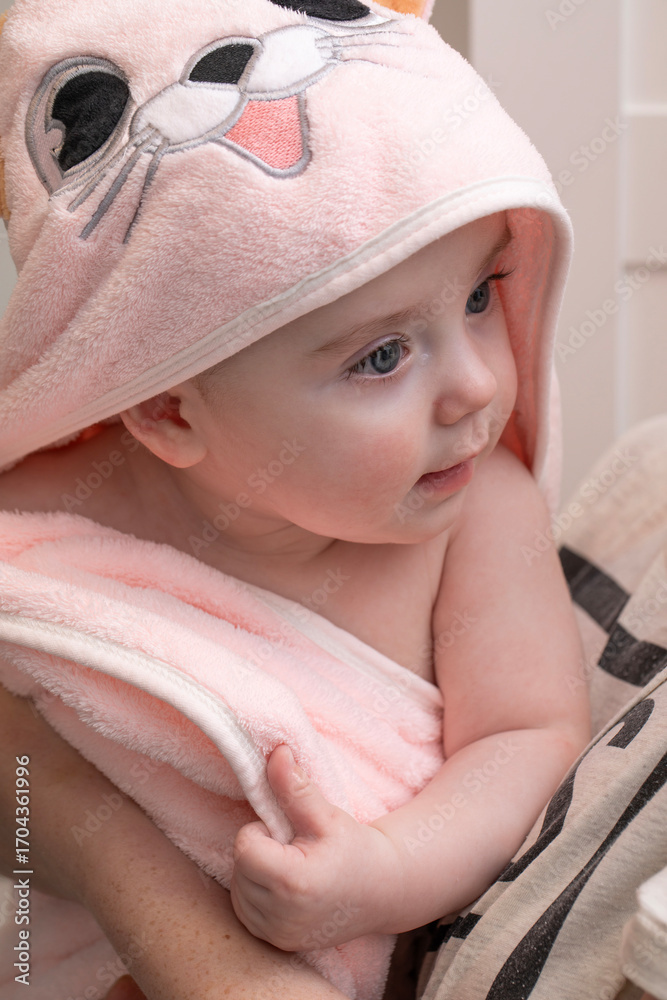 After bathing, Infant is wrapped in a pink terry towel.