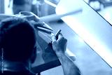 Wooden brace and light are used. Inside a Garage, an automotive technician is shown from the shoulders up using a specialized tool to repair a dent on a gray automobile