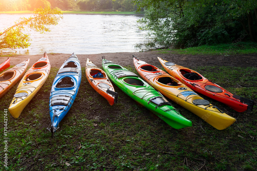 Row colorful kayaks rest on the grassy shore of a calm lake, ready for paddling. They are lined up on the grassy bank, waiting for people to enjoy a tour