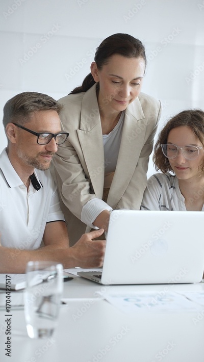 Business team collaborating on a project, analyzing data on a laptop during a productive office meeting, demonstrating teamwork and problem solving skills