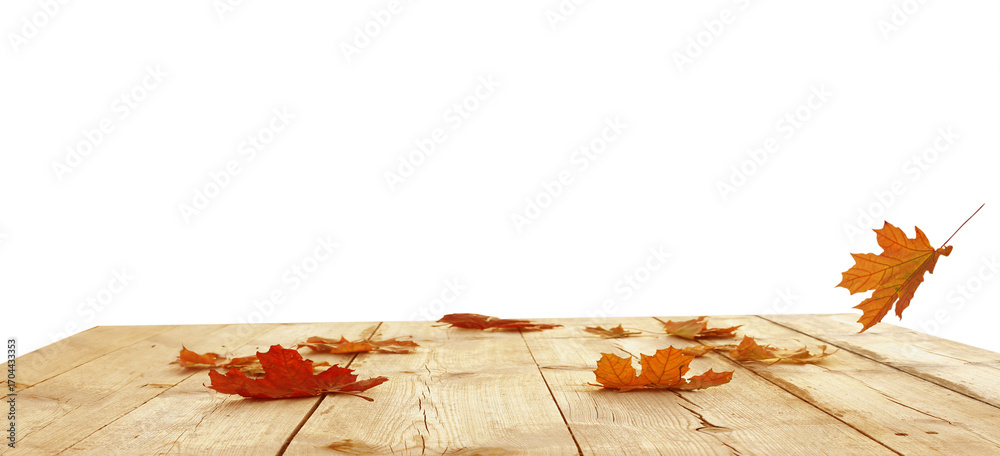 Autumn maple leaves on wooden table. Autumn Product podium isolated