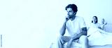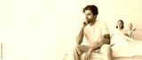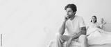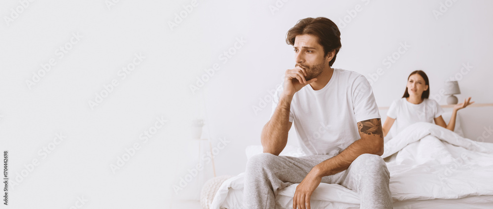 Depressed millennial caucasian male with stubble sits on bed, angry wife screams and swears in bedroom interior, empty space. Divorce, quarrel, breakup, family problems and erectile dysfunction