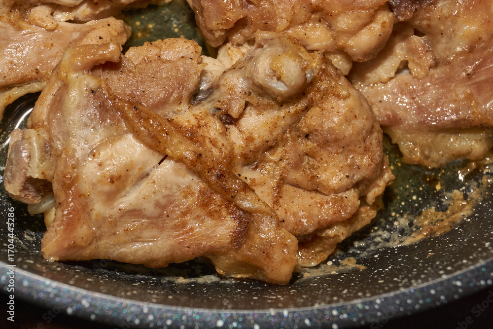 Pieces of chicken meat are fried in a frying pan, exuding flavor and mouth-watering appearance. Delicious chicken pieces are fried in a frying pan until golden brown.