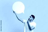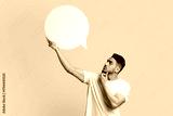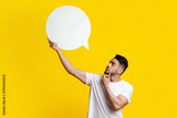 Pensive attractive middle eastern millennial man showing blank speech bubble and touching his chin, sharing his thoughts, yellow studio background, copy space. Millennials communication concept