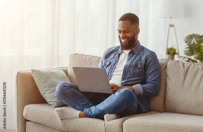 Smiling millennial black bearded male work on pc on sofa in living room interior, checking email in morning, writing message in social network. Online game, video call, freelance, surfing in internet
