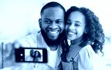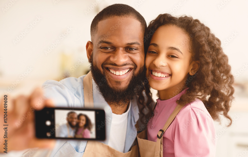 Time With Family. Closeup portrait of happy african american man and girl taking selfie in the kitchen at home, using mobile phone. Smiling black dad and daughter making photo, selective focus
