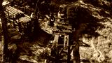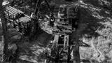 A construction crew collaborates to install a timber bridge in a forested region. Heavy equipment and logs are positioned as workers coordinate their efforts under clear blue skies.