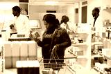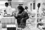 Woman customer searching pharmacy shelves for over the counter pills and supplements, focused on finding medication and health products while reading the labels from dispensary.