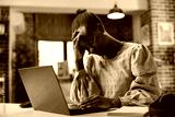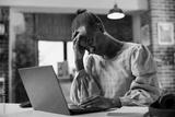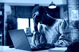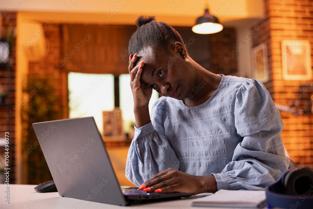 Overworked businesswoman in apartment, showing evening fatigue during remote work. Stressed and upset freelancer rubs forehead with one hand while typing on laptop, struggling to manage schedule.